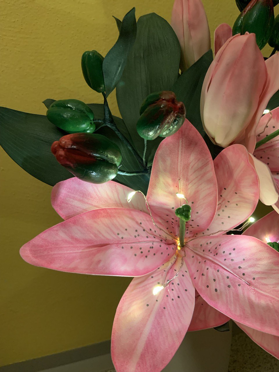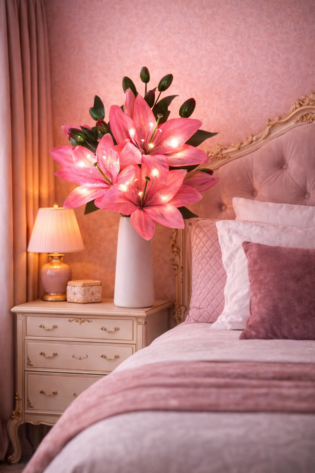 Tato elegantní lampa s realistickými liliemi promění každý interiér v oázu klidu a romantiky. Pečlivě ručně vyrobené květy z prémiových materiálů (foamiranu) působí jako živé a zaručeně upoutají pozornost každého hosta.