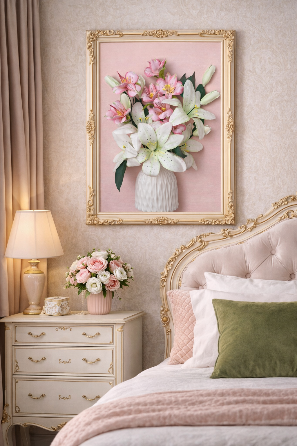 Tento okouzlující květinový obraz na plátně vyzařuje něžnost, eleganci a romantickou atmosféru. Na jemném růžovém pozadí se rozprostírá krásná květinová kompozice - sněhobílé lilie a jemné růžové květy, pečlivě aranžované v minimalistické bílé plastové váze.