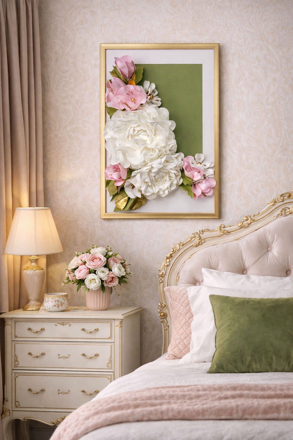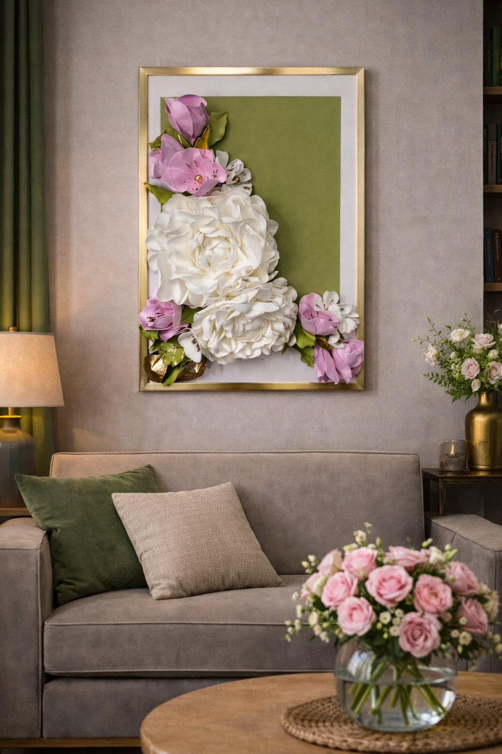 Tento úžasný obraz květin z pěnové hmoty je oslavou elegance, jemnosti a nadčasového luxusu. Bohatá kompozice sněhobílých pivoněk, růžových a bílých květů působí vzdušně a romanticky, zatímco olivové listy se zlatými odlesky dodávají obrazu nádech vznešenosti a sofistikovanosti.
