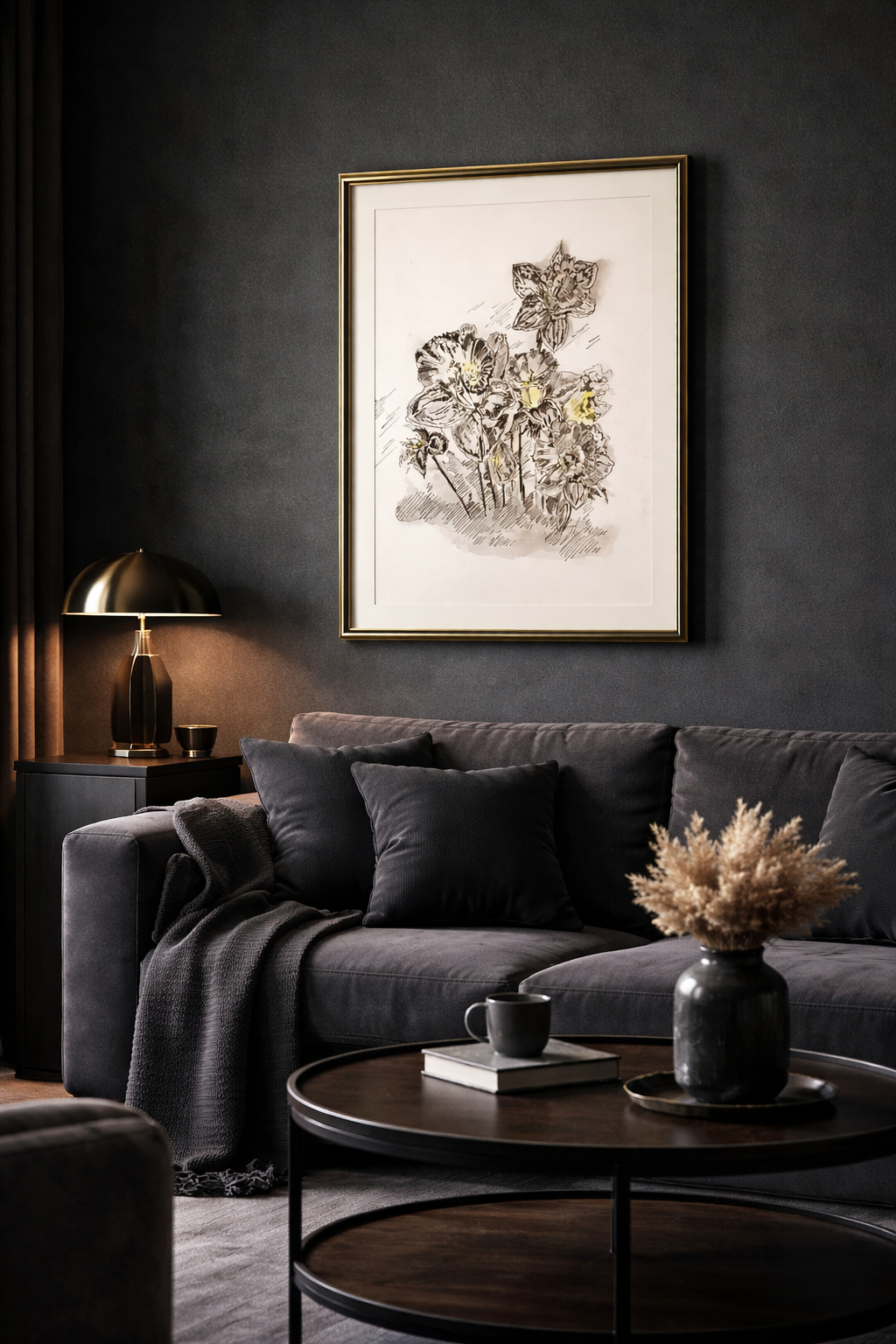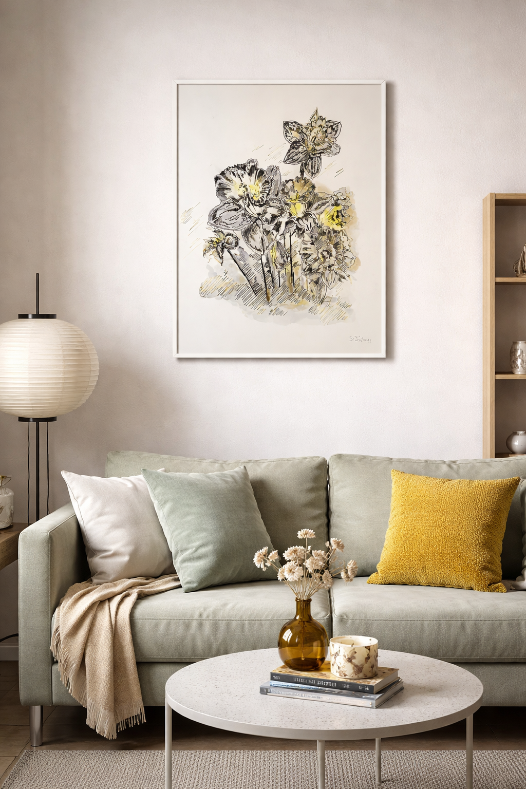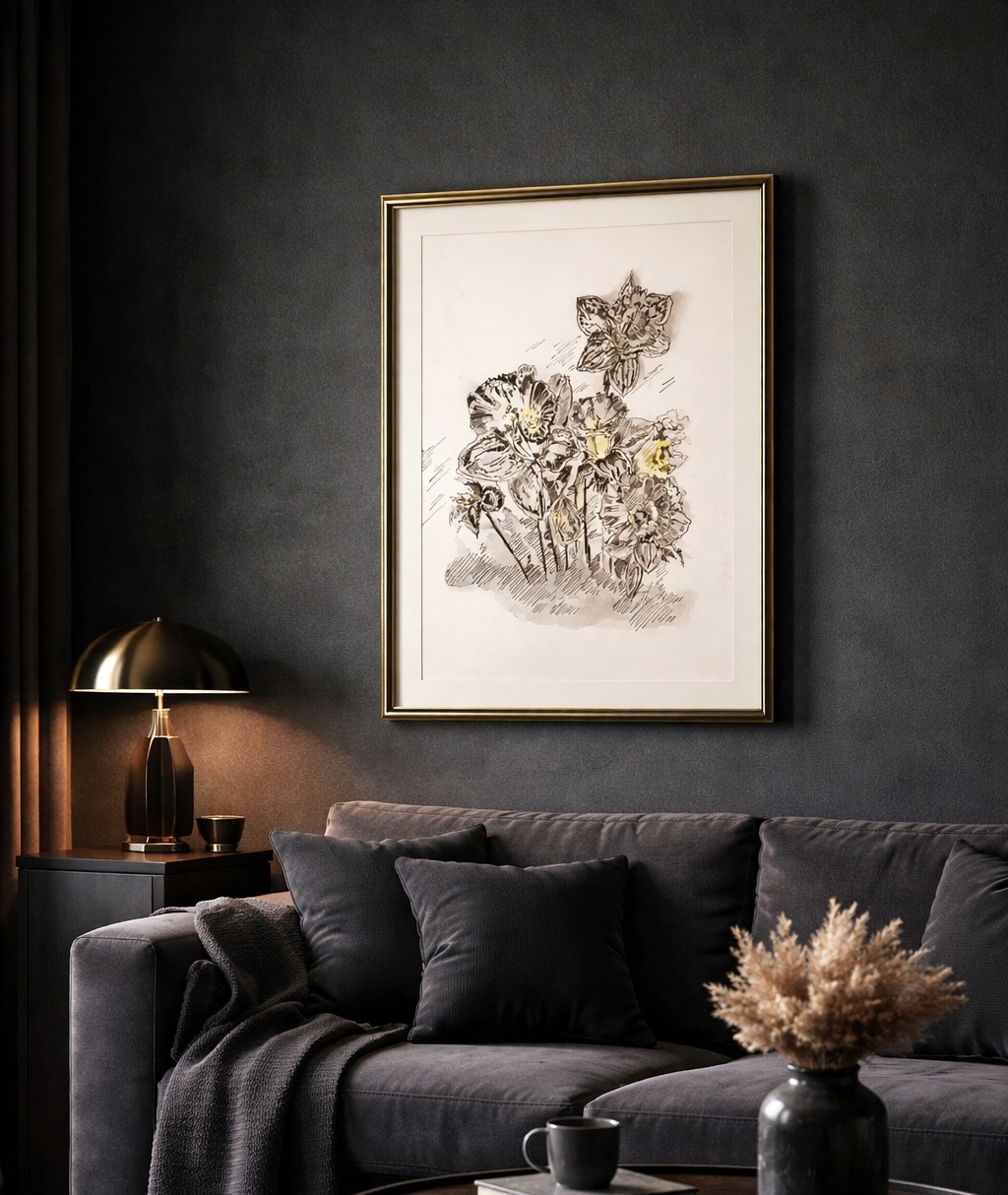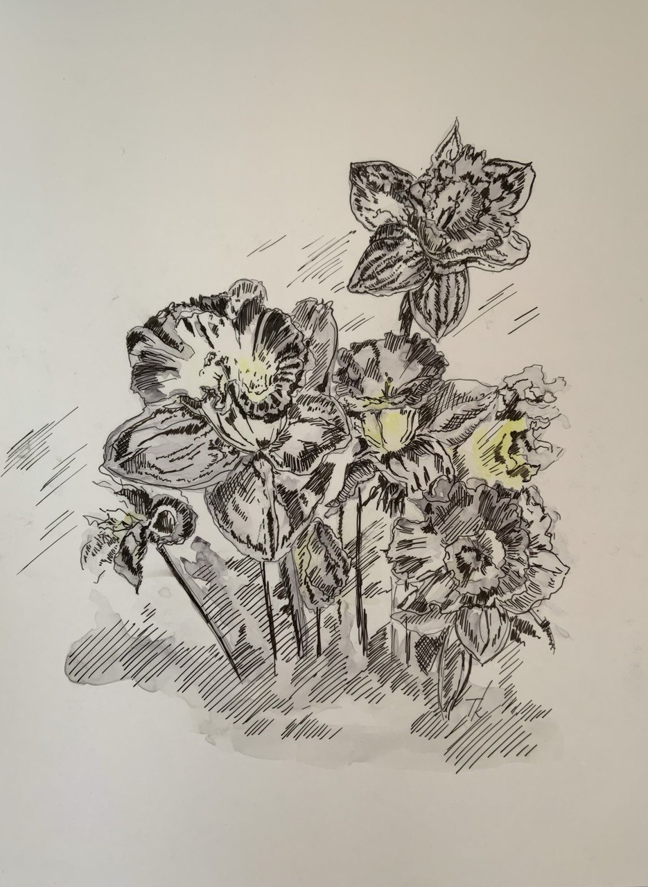 Jemná a lyrická kompozice květin zachycuje skupinu narcisů ve světlých tónech šedé a žluté. Kombinace jemné perokresby s akvarelovou malbou vytváří vzdušný a téměř snový dojem. Světelné akcenty v květech dodávají dílu křehkou eleganci a zároveň působí svěže a jarně.