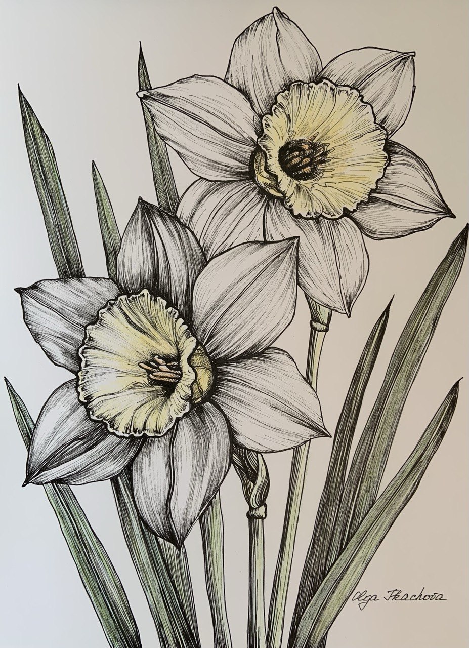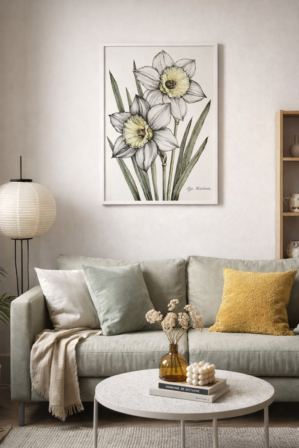 Liniová kresba zobrazuje narcisy v jejich čisté, rozpoznatelné formě. Jemné a klidné tahy zdůrazňují strukturu květů i štíhlé listy bez zbytečných detailů. Minimalistické provedení nechává vyniknout eleganci a rovnováhu tvarů. Celek působí svěže, lehce a nadčasově.