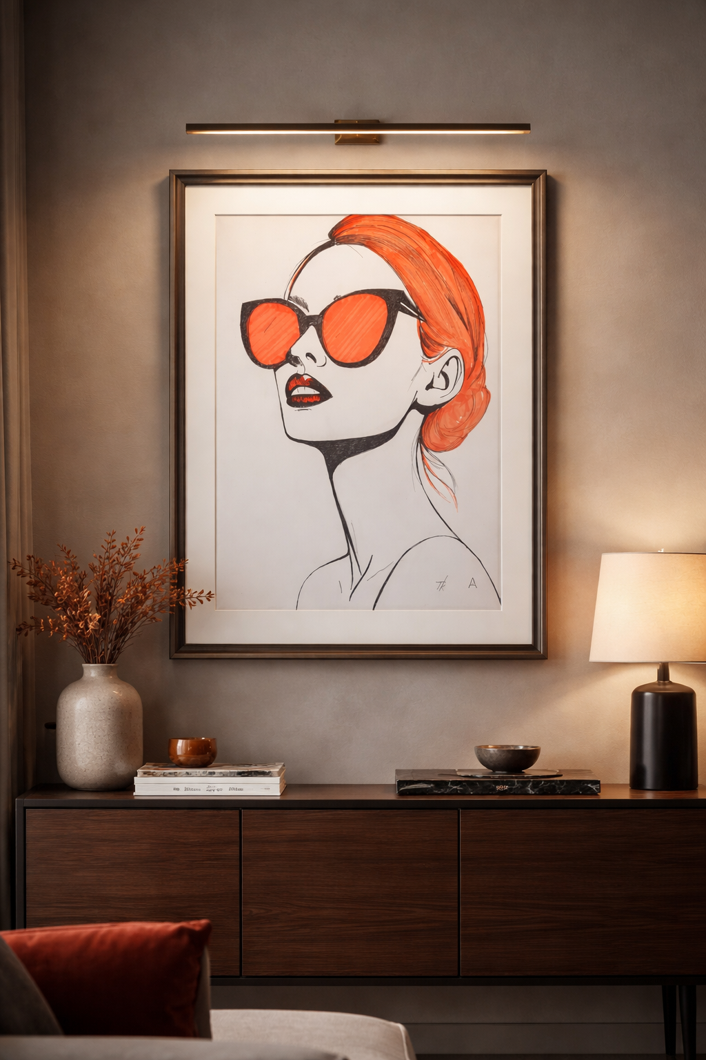 Stylizovaný portrét ženy se slunečními brýlemi a vyčesanými vlasy je proveden v minimalistickém výtvarném pojetí. Černobílá linie je doplněna kontrastní oranžovou barvou, která zvýrazňuje brýle, rty a vlasy. Dílo využívá jednoduchosti a čistoty formy k dosažení vizuálního účinku a soustředění pozornosti na klíčové prvky obličeje.