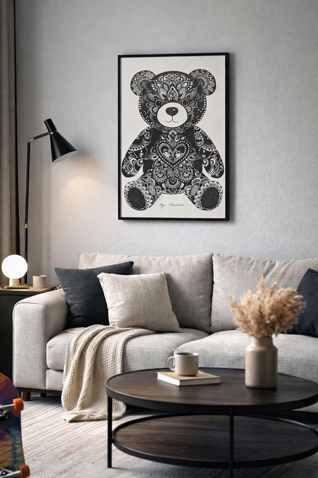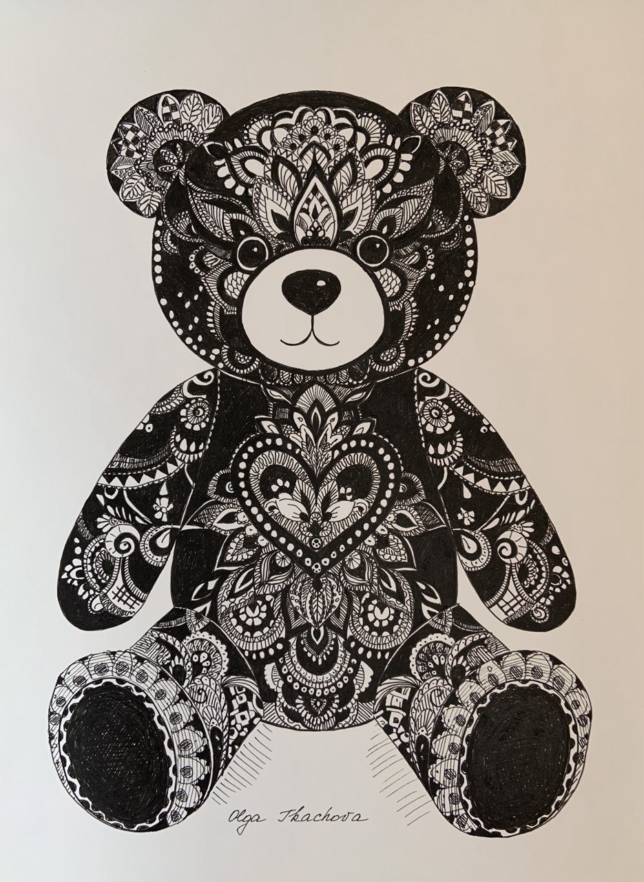 Ilustrace zobrazuje medvídka zdobeného bohatým ornamentálním vzorem, který připomíná ruční kresbu a dekorativní motivy. Kombinace hravého tvaru a detailní struktury vytváří spojení dětské něhy a trpělivé, soustředěné práce. Celek vyzařuje laskavost, fantazii a jemnou hravost.