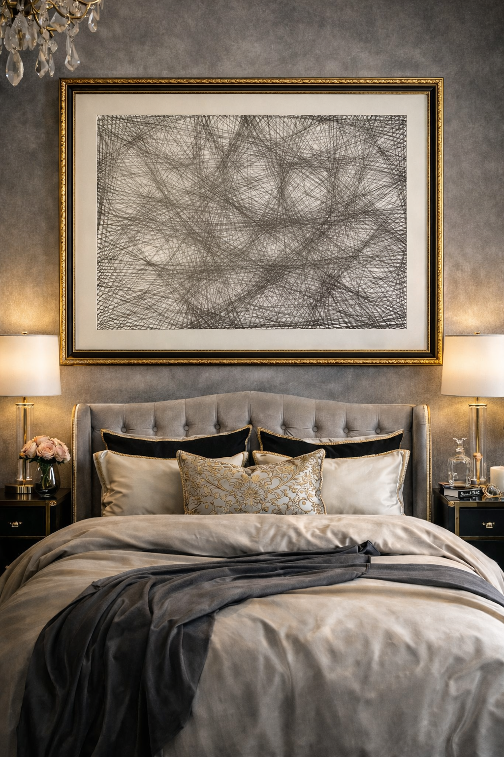 Abstraktní kresba tvořená hustou sítí jemných čar vytváří dynamickou kompozici plnou pohybu a energie. Překrývající se linie budí dojem chaosu i harmonie zároveň a ponechávají prostor pro osobní interpretaci diváka.