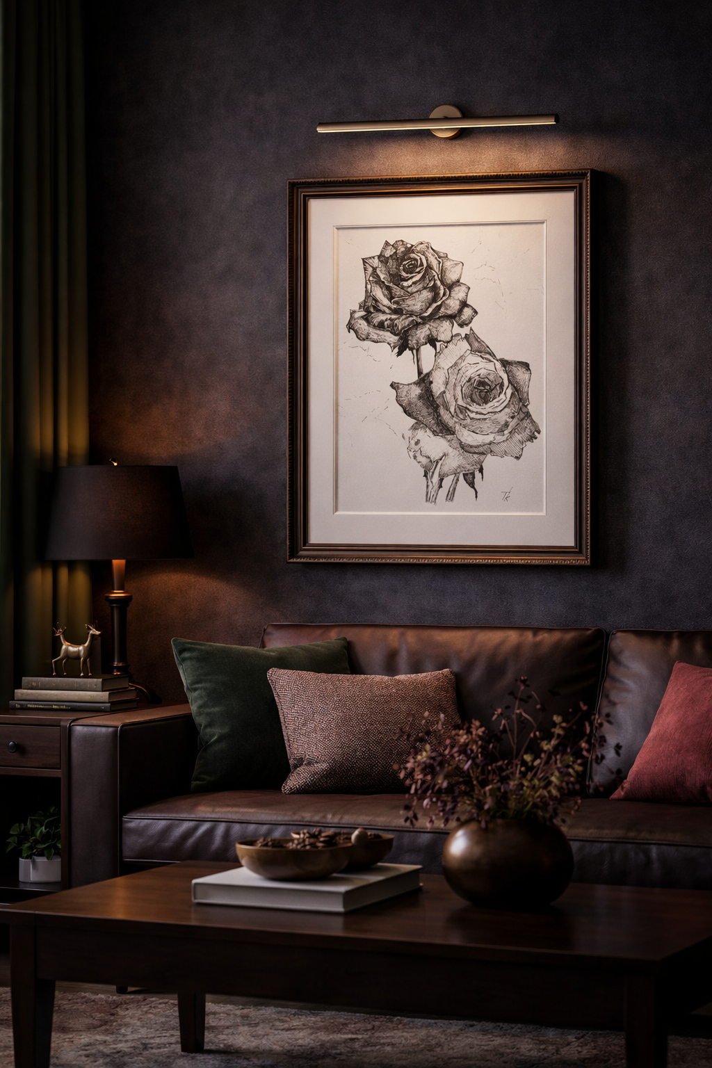 Dvě rozkvetlé růže jsou ztvárněny precizními tahy perem, které zdůrazňují texturu okvětních lístků a jejich prostorovou hloubku. Temnější stínování a výrazná linie dávají květinám dramatický výraz. Kresba působí elegantně a jemně, přičemž zachycuje přirozenou krásu květin v realistickém i uměleckém pojetí.