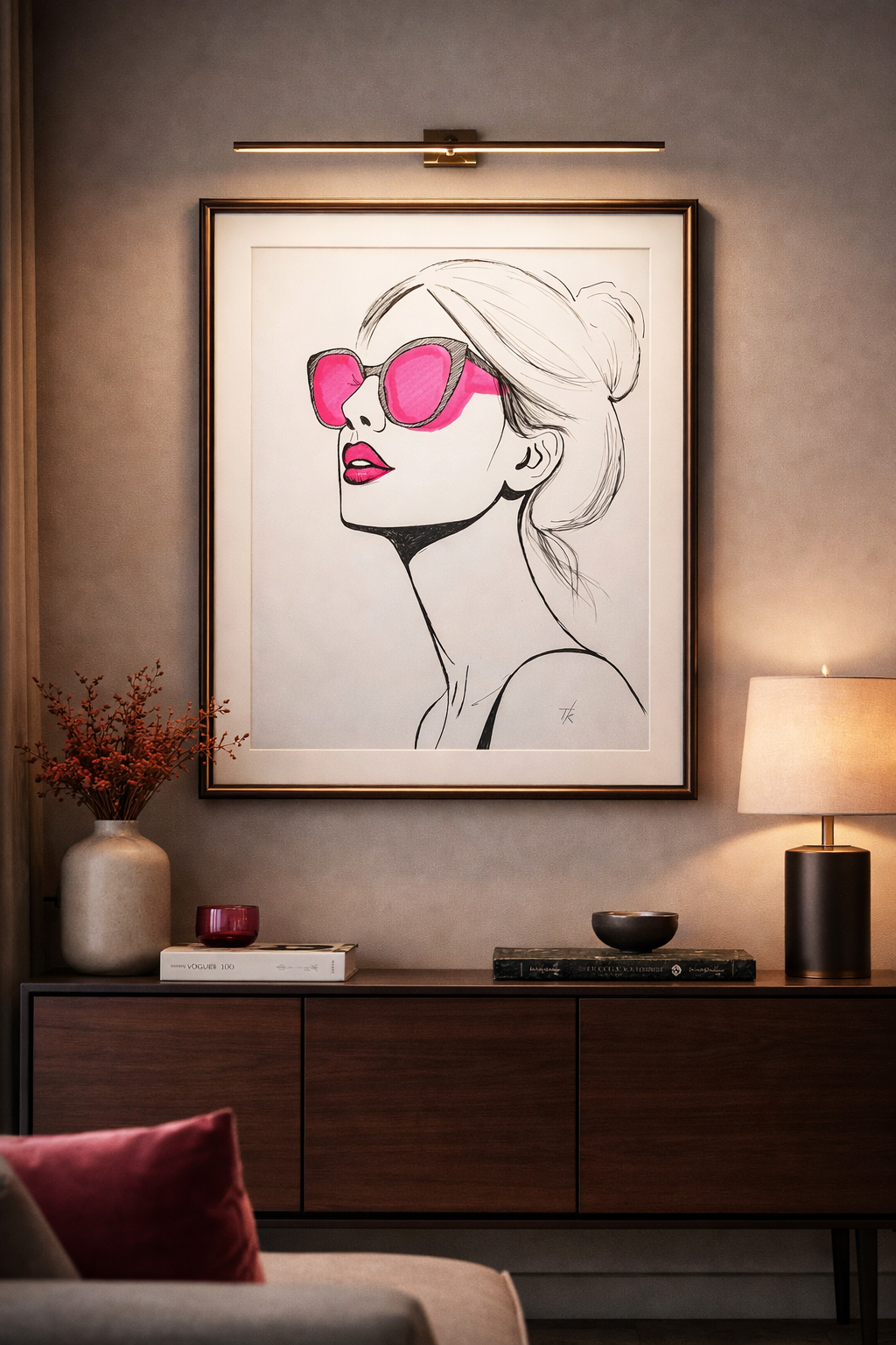 Elegantní ženský portrét zaujme minimalistickou linií a kontrastem mezi černobílou kresbou a sytě růžovými akcenty na brýlích a rtech. Růžová barva zde symbolizuje sílu, sebevědomí a originalitu. Stylizace obličeje i účesu působí současně jemně a odvážně, čímž dává obrazu moderní a výrazný charakter.