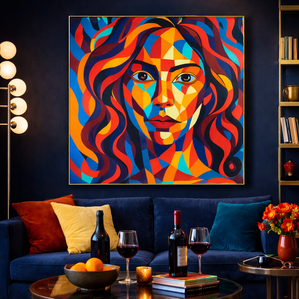 V této zářivé olejomalbě jsem vnesla svou vášeň pro geometrické tvary a živé barvy do portrétu, který vyzařuje energii a emoce. Každá aspekt tváře odráží složitost a krásu individuality. Odvážná souhra teplých a chladných tónů vdechuje život a pohyb a vybízí váš prostor k pulzování kreativitou a odvážným výrazem. Toto dílo vnáší do každé místnosti inspirativní a dynamickou energii.