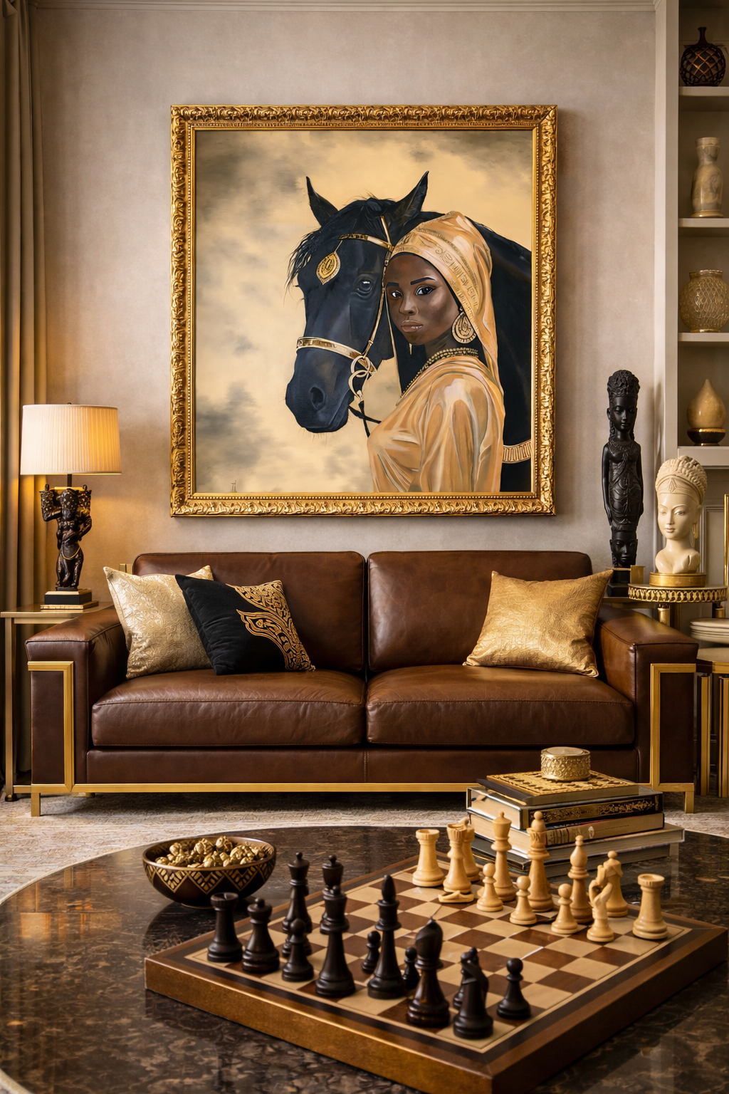 Ntumo — stvořená s požehnáním, tato jedinečná malba ztělesňuje spojení síly, ušlechtilosti a duchovní energie. Na teplém zlatavě žlutém pozadí, připomínajícím ranní opar savany, se černý kůň a africká dívka ve třpytivém rouchu stávají symboly čisté síly a vnitřní harmonie.