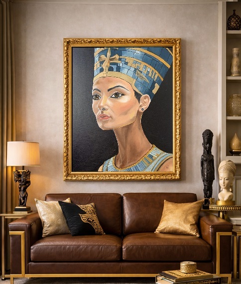Elegantní harmonie mezi modrými a zlatými tóny odkazuje na vznešenost starověkého Egypta, zatímco kontrastní černé pozadí zdůrazňuje nadpozemskou důstojnost postavy. Odraz tajemství není pouze portrét — je to okno do éry, kde krása a síla byly jedním a týmž.