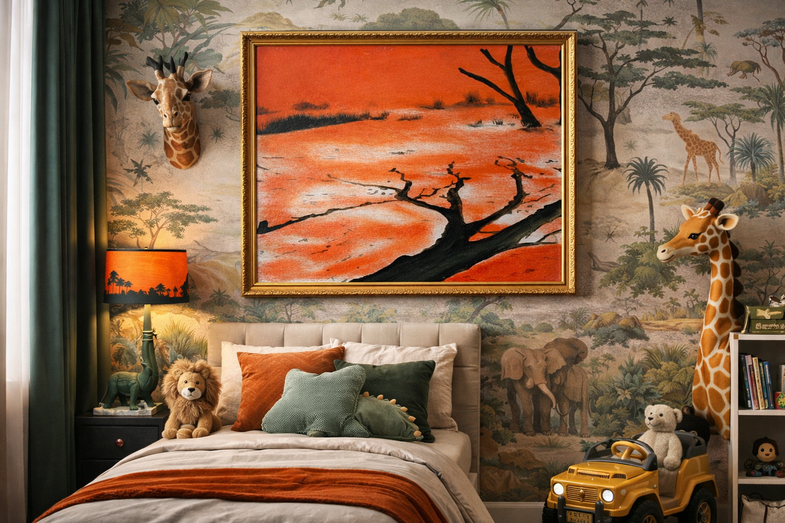 Expresivní krajina zachycuje dramatickou savanu zalitou sytě oranžovým světlem, které připomíná západ slunce nebo žár rozpálené země. Tmavé siluety stromů kontrastují s intenzivním pozadím a vytvářejí silnou, emotivní atmosféru plnou napětí i krásy divoké přírody.