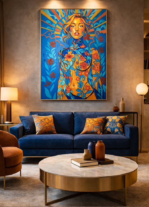 Do tohoto obrazu jsem vložila živoucí emoce, propojila realismus s výraznou energií pop-artu. Květinové vzory symbolizují růst a vnitřní sílu a rozkvétají na celé postavě jako oslava krásy a odolnosti života. Toto dílo vyzařuje teplo a vitalitu a slibuje naplnit jakýkoli prostor dynamickou barvou a posilující přítomností, a vyzývá diváky ke spojení s přírodou a jejich vlastním pulzujícím duchem.