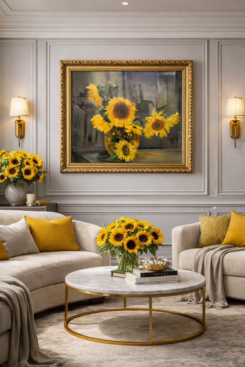 Zářivé slunečnice ve skleněné váze přinášejí do prostoru teplo a radost. Kontrast jasně žlutých květů s tlumeným pozadím zvýrazňuje jejich energii a vytváří harmonickou kompozici plnou světla a optimismu.