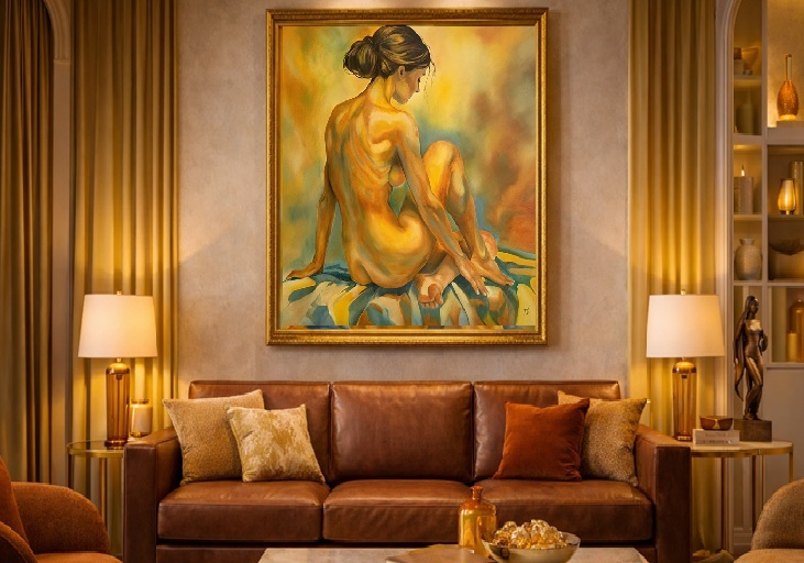 In this piece, I poured warmth and vulnerability into every brushstroke, celebrating the natural beauty of the human form. The glow surrounding her evokes a serene inner light, inviting viewers to feel calm and connected. I wanted this painting to radiate tranquility and strength, making any space come alive with a quiet, intimate energy.