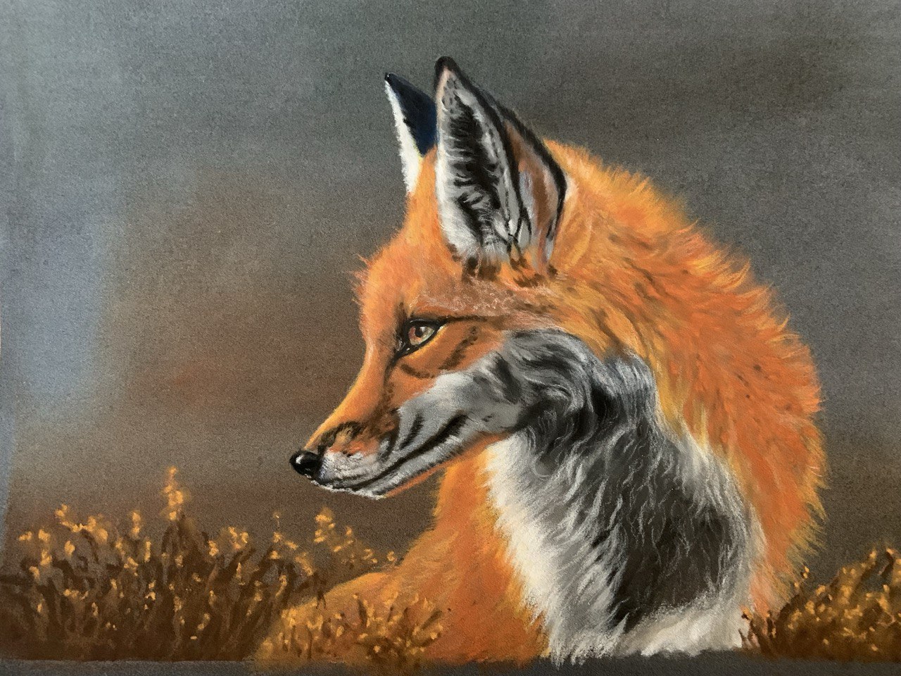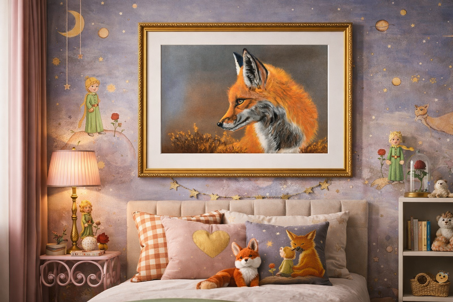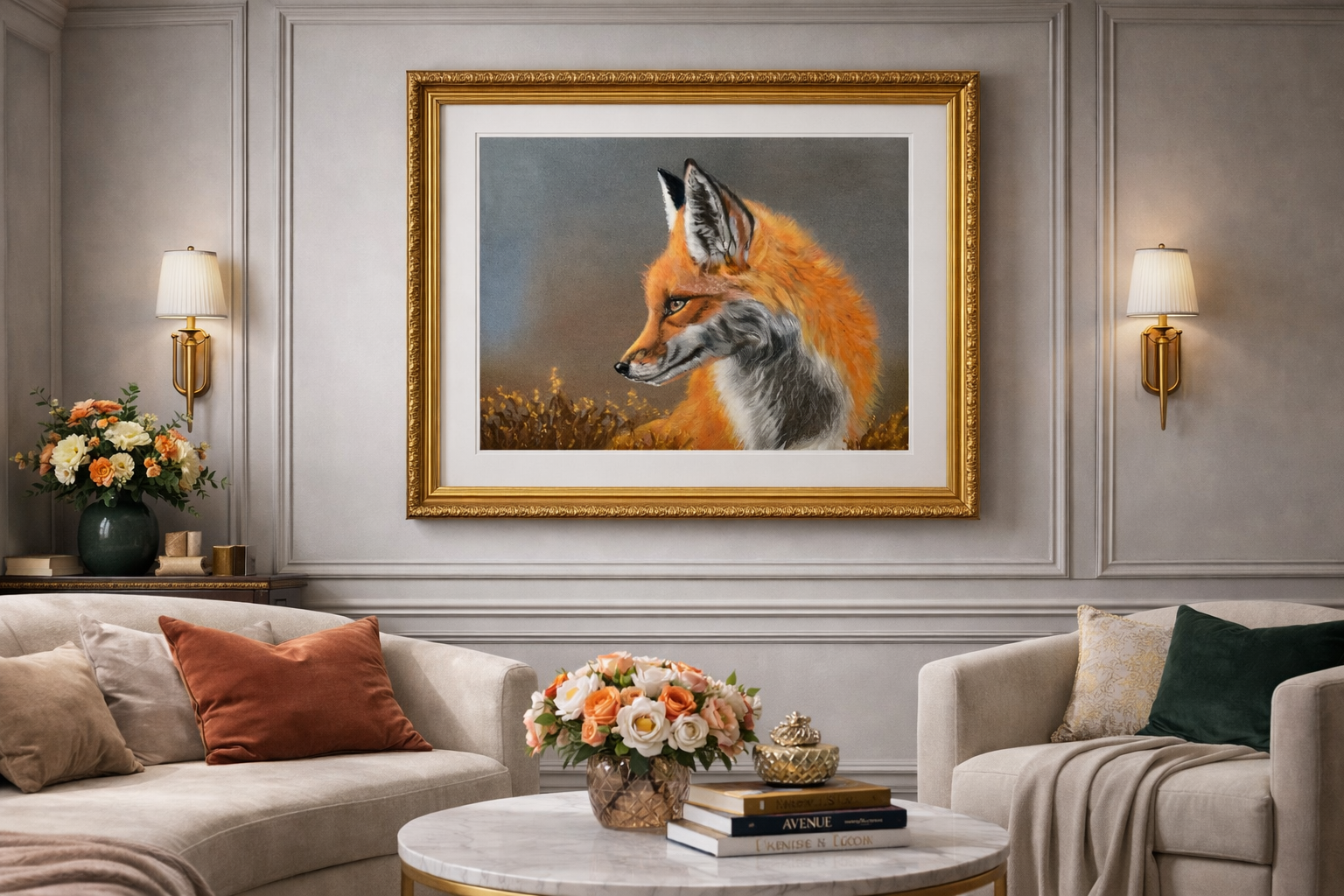 Realistický portrét lišky zachycuje její bystrý výraz a přirozenou eleganci. Teplé odstíny oranžové srsti kontrastují s jemným pozadím a vytvářejí harmonickou, klidnou atmosféru, která podtrhuje krásu a divokost tohoto lesního zvířete.