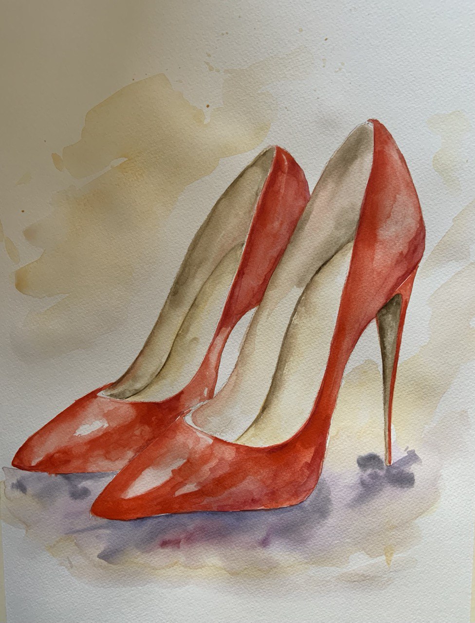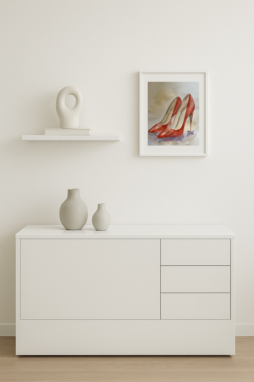 Obraz zobrazuje pár červených lodiček jako symbol elegance, ženskosti a sebevědomí. Akvarelová lehkost a jemné stíny zdůrazňují tvar a ladnost siluety. Sytá červená barva přitahuje pozornost a dodává kompozici energii.