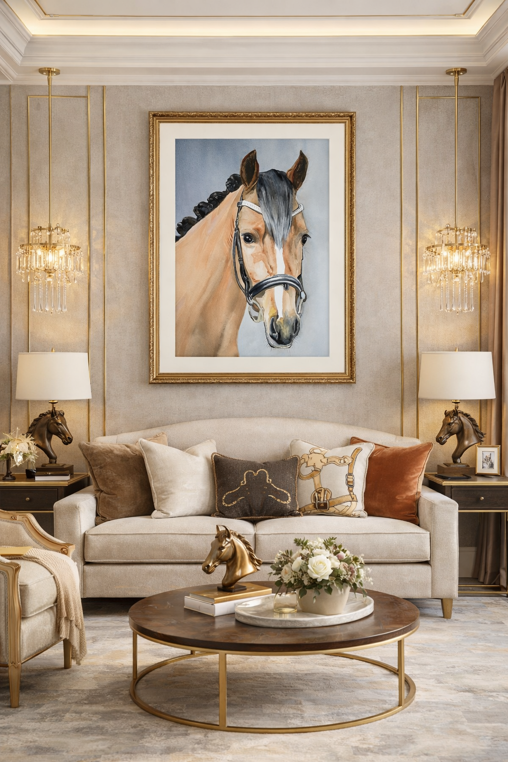 Akvarel zachycující hrdý pohled ušlechtilého poníka. Precizní práce se světlem a detailem vyzdvihuje klidnou sílu a eleganci zvířete.