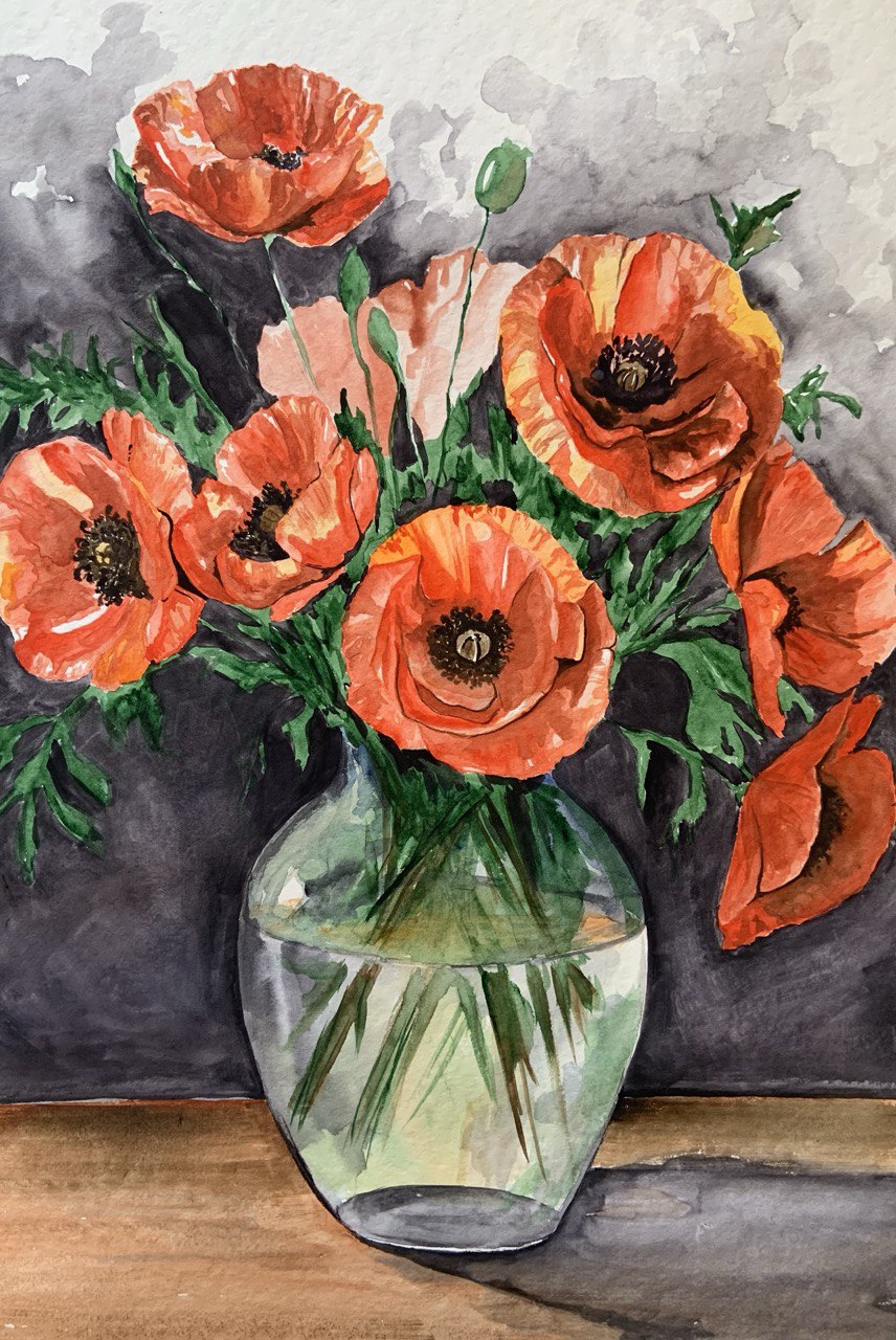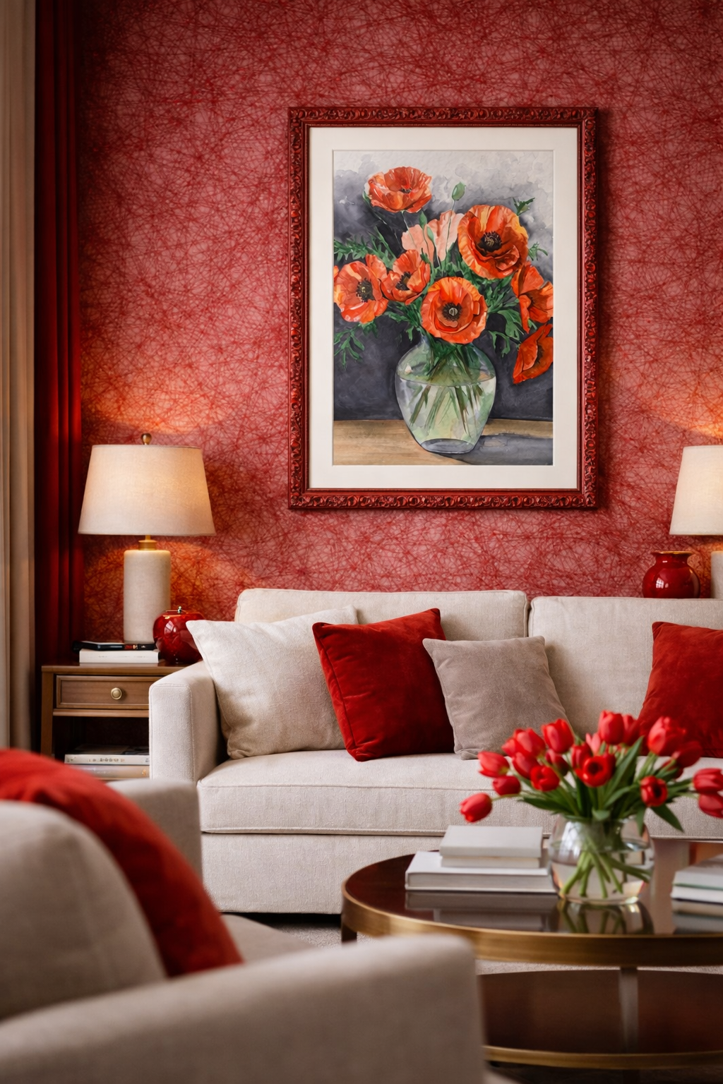 Obraz zachycuje rudé máky ve skleněné váze jako symbol pomíjivé krásy a intenzity okamžiku. Jemná průsvitnost vázy kontrastuje s výraznými barvami květů, které působí živě a neklidně.