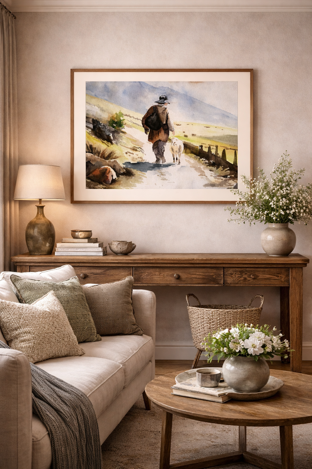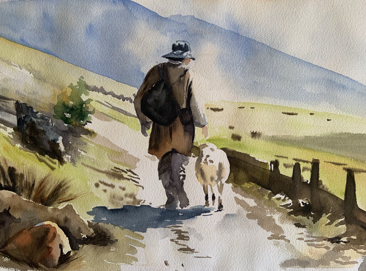 Obraz zachycuje osamělého poutníka kráčejícího krajinou v doprovodu ovce. Široký prostor a měkké akvarelové přechody vytvářejí pocit klidu, pomalosti a plynutí času. Postava splývá s krajinou a působí jako její přirozená součást.