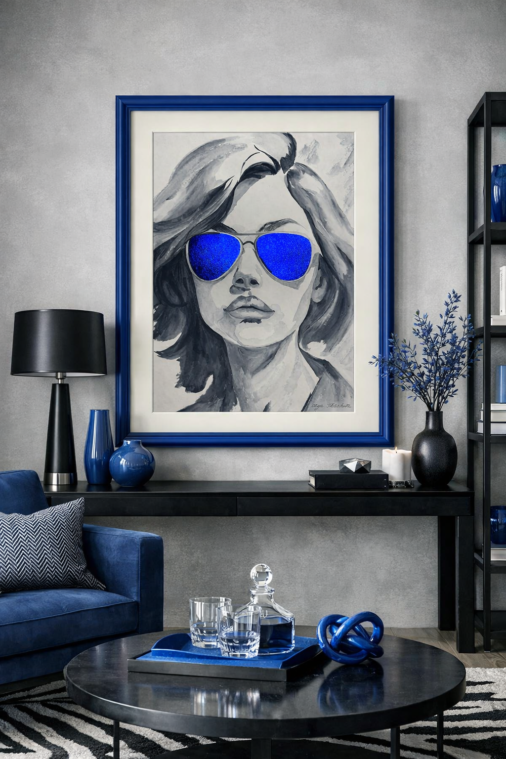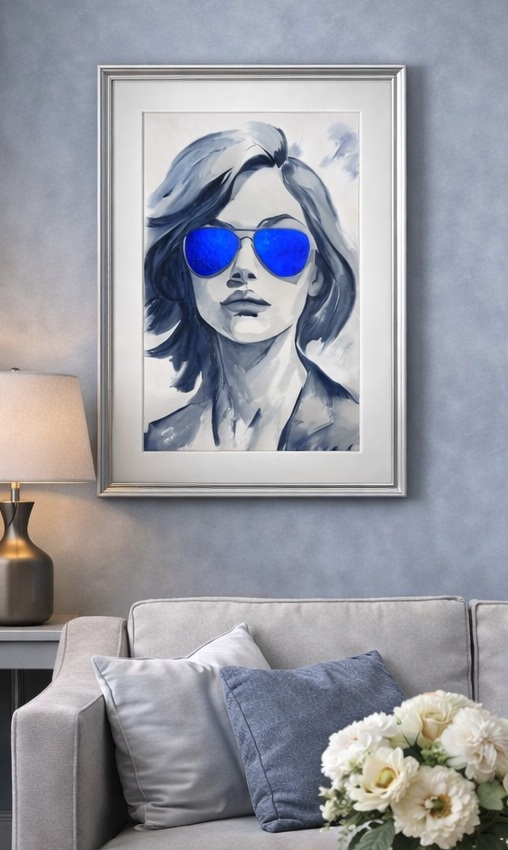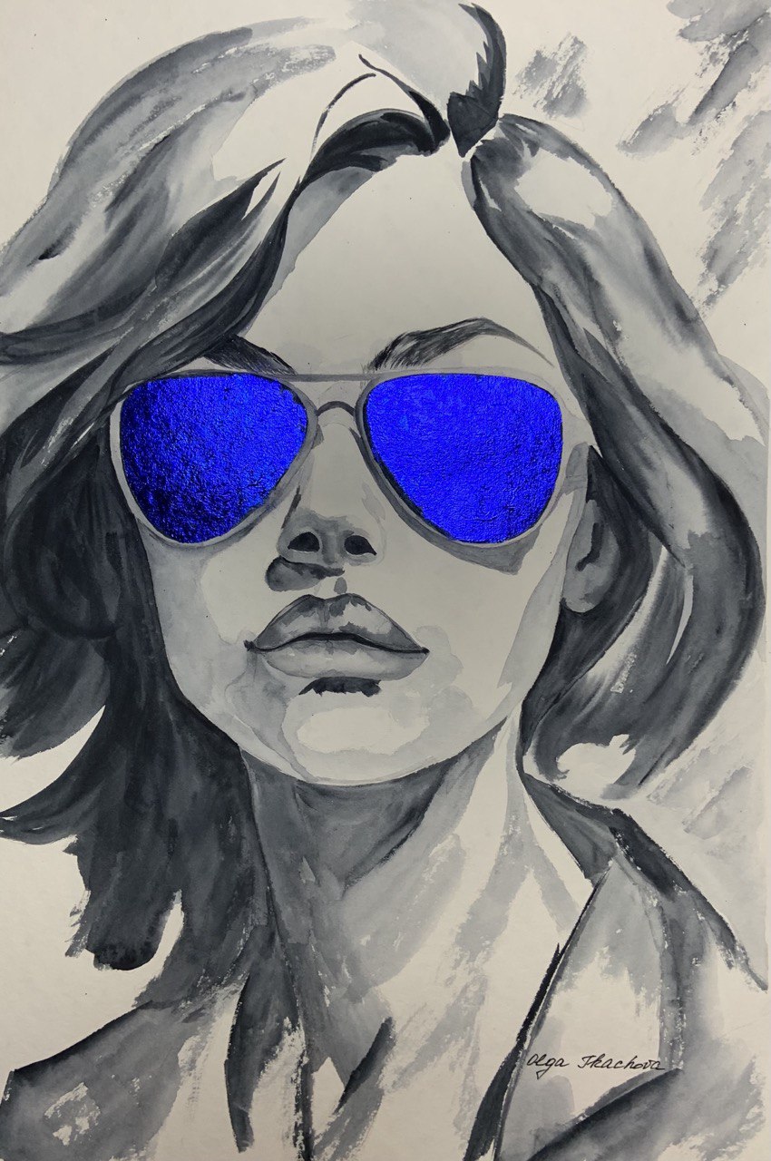 Portrét ženy v tmavých brýlích je postaven na kontrastu mezi monochromatickým provedením a sytě modrými skly. Modrá barva působí jako akcent vnitřního světa, emocí nebo myšlenek skrytých před okolím. Volné akvarelové tahy dodávají obrazu lehkost a současný výraz.
