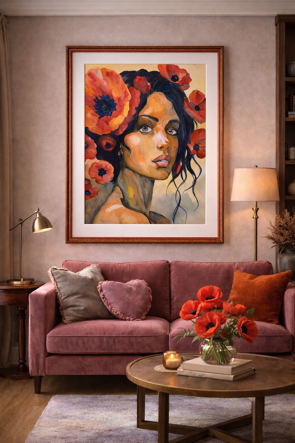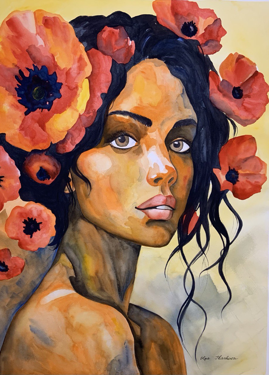 Portrét ženy je propojen s vlčími máky jako symbolem síly, vášně a vnitřní svobody. Květiny splývají s jejími vlasy a vytvářejí obraz jednoty člověka a přírody. Teplé červené a zlaté tóny zdůrazňují emocionalitu a životní energii. Celek působí výrazně, smyslně a lehce snově.